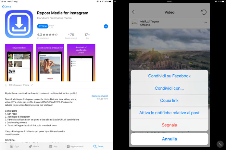 Per eseguire il download dei video da Instagram su iOS ci si può affidare all’app Repost Media for Instagram, disponibile gratuitamente a questo link. Segnaliamo che l’app è sviluppata dall’italiano Domenico Nicoli, dunque per qualsiasi domanda o dubbio si ha la possibilità di ricevere assistenza direttamente in italiano.
