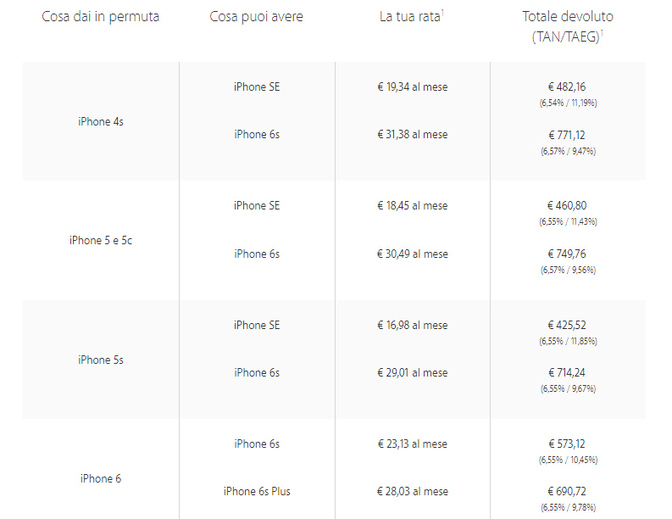 Quanto vale invece un iPhone in perfette condizioni? Sarà un esperto presente nell’Apple Store a valutare il vostro smartphone, ma la Apple per comodità degli utenti, ha pubblicato una tabella dove è possibile calcolare il valore approssimativo del proprio iPhone. Ad esempio, se avete un iPhone 5s e lo sostituite con il nuovo SE le 24 rate mensili avranno un costo di 16,98€ l’una. Invece, la permuta dell’iPhone 6 vi permette di acquistare il nuovo iPhone 6s Plus al prezzo di 690,72€, pagabili in 24 rate da 28,03€ l’una.