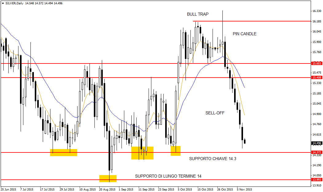 Argento: prezzi in caduta libera. Se perde il supporto di 14$, può crollare del 30-40%