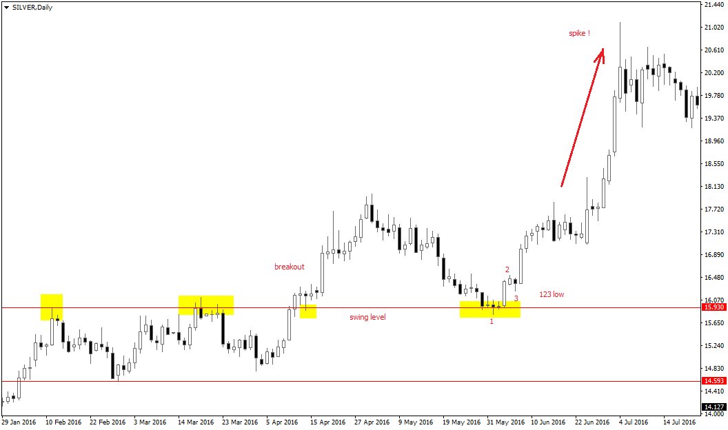 Il chart in basso si riferisce al mercato del SILVER, ovvero dell’argento cash. Il pattern 123 low si forma a partire da una zona di supporto chiave: il punto 1 si concretizza dopo un fakey pattern a bassa volatilità seguito da una inside bar. Il punto 2 è una micro-resistenza formatasi dopo una candela ad ampio range; il punto 3 viene identificato da una piccola tailed bar. Il successivo breakout del punto 2 attiva il pattern, suggerendo la possibilità di entrare long. In meno di due mesi i prezzi passeranno da area 16,5 dollari a poco più di 21 dollari l’oncia.