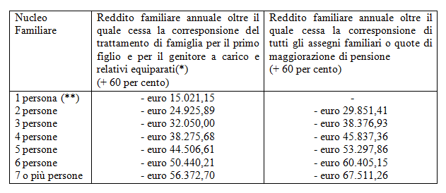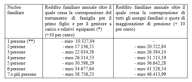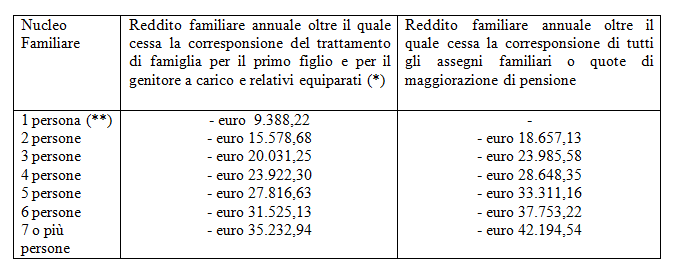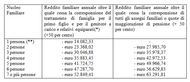 - i limiti di reddito familiare da applicare ai fini della cessazione o riduzione della corresponsione degli assegni familiari e delle quote di maggiorazione di pensione