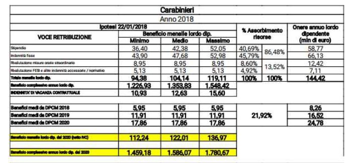 Nell’incontro andato in scena il 22 gennaio 2018 l’amministrazione ha presentato le tabelle con le proiezioni dell’aumento di stipendio per ogni ruolo. Tabelle che sono state svelate in esclusiva da Infodifesa.it, dalle quali si rilevano i seguenti importi: