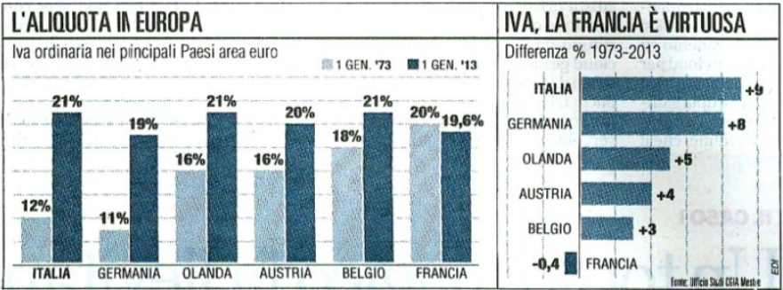 Secondo lo studio della CGIA l’Italia nel 1973 era il Paese, eccetto la Germania, in cui veniva applicata l’aliquota IVA più bassa, mentre oggi è il Paese in cui si è registrato l’aumento più forte nel tempo, pari a quasi 10 punti. Seguono: