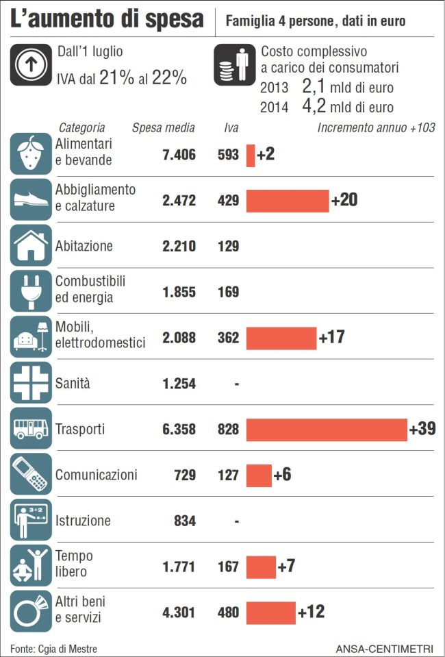 Secondo la CGIA di Mestre su una famiglia media di 3 persone l’aumento sarà di circa € 88 all’anno, mentre su una famiglia di 4 individui l’importo salirà a € 103. Tra i beni interessati dall’aumento dell’IVA, quelli di maggior consumo tra le famiglie: