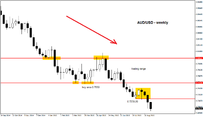 Sul forex la valuta continua a perdere colpi, tanto che il tasso di cambio AUD/USD è sceso sui minimi più bassi da oltre 6 anni sotto la soglia psicologica di 0,70. Nell’ultimo anno l’Aussie ha perso quasi il 35% del proprio valore, ma rischia di sperimentare ulteriori vistosi cali da qui a fine anno se la crisi cinese dovesse peggiorare e provocare un nuovo panic selling sui mercati. Stanotte il cambio è atterrato in area 0,6980, anche se nelle ultime due ore è in corso un rimbalzo verso area 0,7030. Da un punto di vista tecnico, su base settimanale, la perdita del supporto di area 0,7230 ha favorito la caduta fin sotto 0,70. Possibile un rimbalzo di breve termine, ma la tendenza ribassista dovrebbe spingere l’Aussie ancora più giù da qui a fine anno.