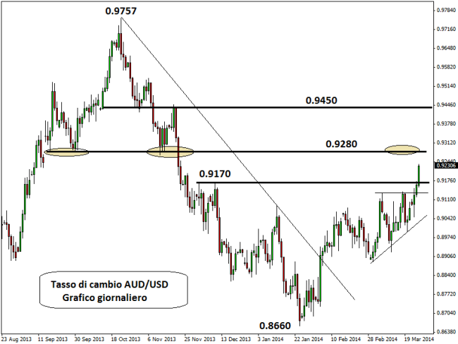 Oggi il dollaro australiano è tra le valute più toniche sul forex, anche più del dollaro neozelandese interessato di recente dall’aumento dei tassi di interesse al 2,75%, un quarto di punto in più rispetto al costo del denaro fissato attualmente dalla RBA. Il tasso di cambio AUD/USD è salito questa mattina fino a 0,9235, ai massimi da fine novembre scorso. Negli ultimi due mesi l’Aussie ha guadagnato il 6,2%. Il minimo dell’anno risale al 24 gennaio scorso, quando la quotazione scese a 0,8660.