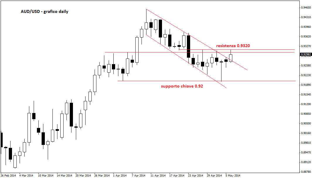 L’ultimo taglio dei tassi da parte della Reserve Bank of Australia (RBA) risale a inizio agosto 2013. Il governatore dell’istituto monetario di Sidney, Glenn Stevens, ha dichiarato nel corso delle ultime riunioni che i tassi di interesse nel paese oceanico potrebbero restare stabili per un periodo prolungato di tempo in attesa di un significativo miglioramento delle condizioni economiche. Sul forex il dollaro australiano sta sperimentando una fase di consolidamento, dopo aver realizzato un interessate rally sul biglietto verde tra inizio febbraio e metà aprile.