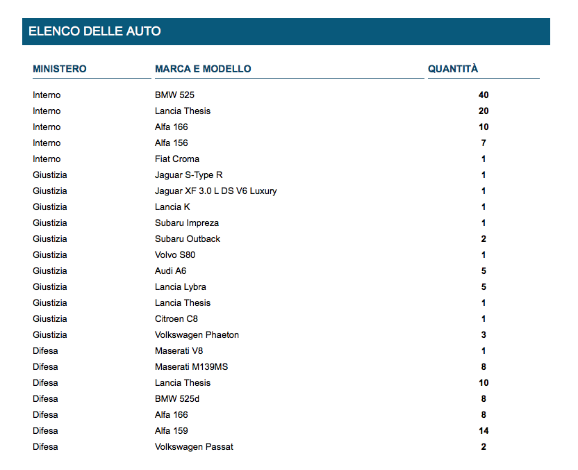 Ecco l’elenco delle auto blu appartenenti al ministero dell’Interno, della Giustizia e della Difesa: