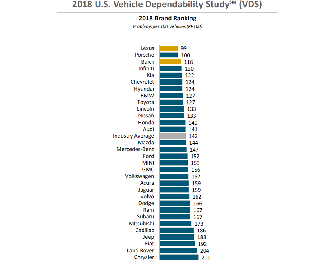 Lo studio è svolto sul territorio degli Stati Uniti ma può fornire importanti spunti anche per il mercato europeo e italiano: Lexus, Porsche e Buick guadagnano punti, mentre Chrysler registra bassi risultati con Land Rover, Fiat, Jeep e Cadillac.