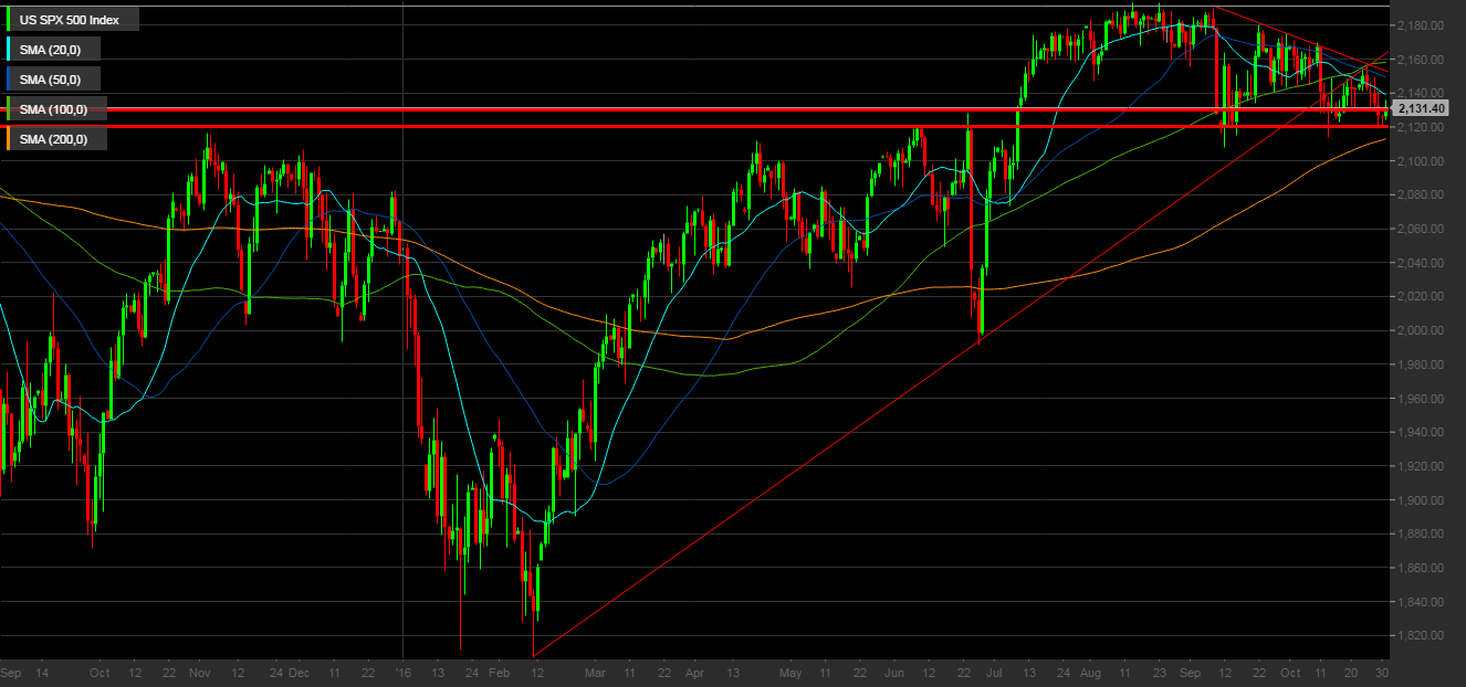 Dopo quattro sedute in rosso dovute all’incertezza proiettata sui mercati dagli scandali sollevati dall’FBI riguardo le mail della candidata repubblicana Hillary Clinton, la borsa USA torna a salire. La seduta di ieri si è conclusa in area 2128 punti per l’S&P500, con i prezzi che tornato a testare il supporto di lungo periodo.
