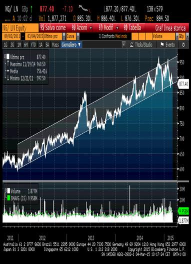 Dal grafico sottostante si evince infatti la bassa volatilità relativa del titolo con minimi crescenti , quasi sempre appoggiati al floor del canale rialzista iniziato 4 anni fa nel settembre 2011, quando quotava 600 pence.