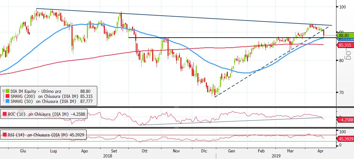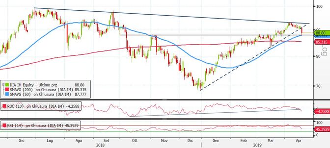 Al momento la spinta ribassista su Diasorin si è ridimensionata grazie al duplice supporto incontrato fra 87,77 e 87,90 euro, area presso la quale passano la media mobile a 50 periodi e il livello statico ereditato dai top relativi di novembre 2018 e marzo 2019.