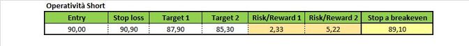 Il breakout del supporto a 87,90 euro, confermato in chiusura, potrebbe suggerisce l’incremento dell’esposizione sulla strategia che avrebbe come primo target l’area dove passa la SMA a 200 periodi, quindi 85,31 – 85,30 euro. Lo stop loss posto sui massimi della candela odierna a 90,90 euro assicura alla strategia su Diasorin un margine molto stretto di errore.