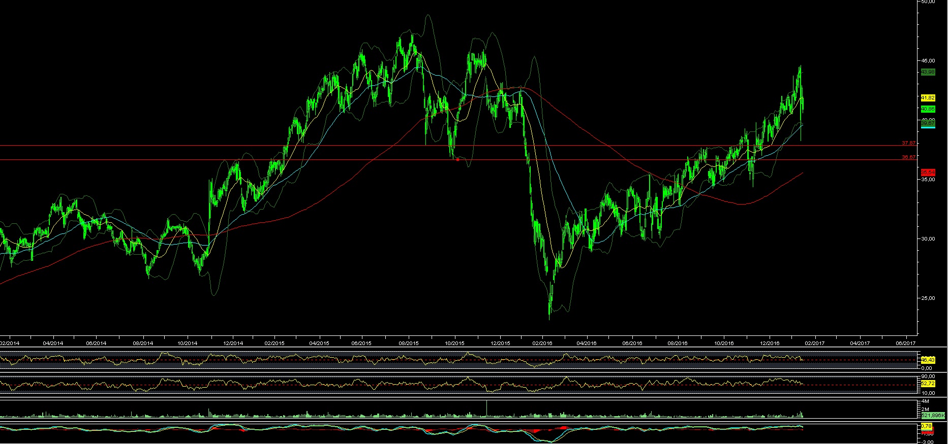 Dall’analisi grafica delle azioni Exor emerge ancora un trend a rialzo visto l’incrocio positivo delle medie mobili semplici di breve, medio e lungo periodo. Il titolo ha fallito il tentativo di superamento della resistenza psicologica posta dalla media mobile di breve a quota €41,83 con volumi abbastanza elevati per quelli registrati nella seduta odierna di Borsa.