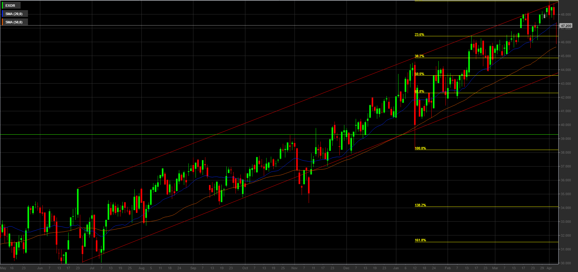 Le azioni Exor aprono la giornata in gapdown e registrano la peggiore performance in borsa, con una variazione percentuale negativa di -3,73% arrivando a toccare un minimo a 45,86 per poi ridurre le perdite nel corso della giornata, scambiando a quota 47,00 al momento della scrittura.