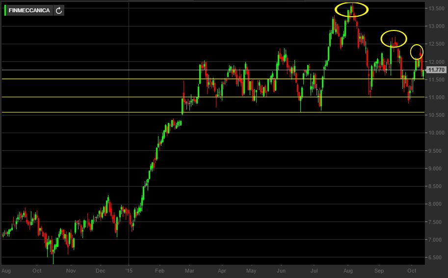 Sul grafico con timeframe settimanale, si nota come il prezzo del titolo Finmeccanica stia oscillando lateralmente in seguito alla sua lunga corsa al rialzo, attestandosi su massimi decrescenti e dando l’impressione che possa essere in corso una fase di distribuzione, preambolo di un’eventuale discesa.