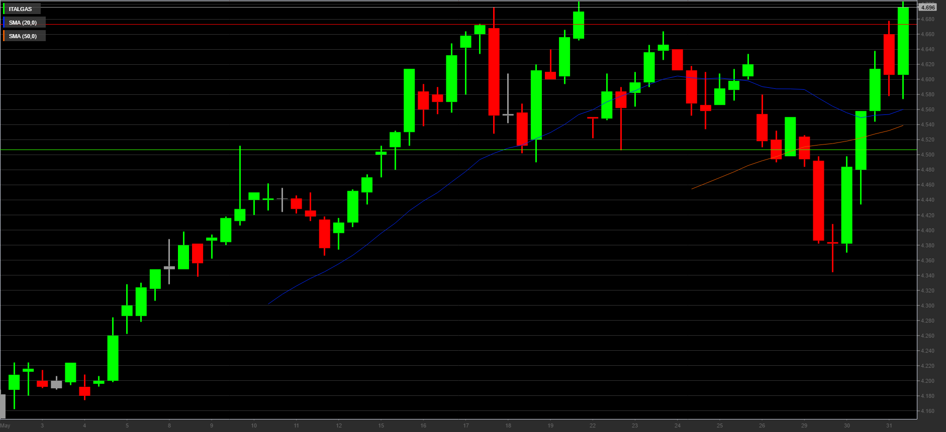 La struttura tecnica di medio periodo del titolo Italgas appare orientata al rialzo, come conferma l’inclinazione delle medie mobili a 20 e 50 periodi sul grafico giornaliero.