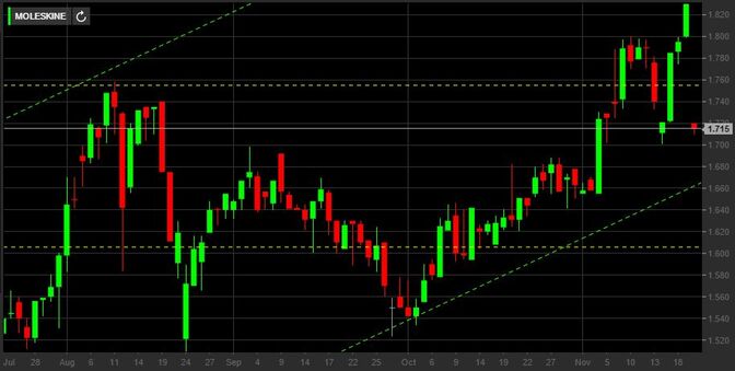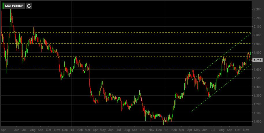 In questo momento le azioni Moleskine stanno perdendo il 7% del loro valore dopo la chiusura positiva di ieri. Il titolo a Piazza Affari segue dall’inizio del 2015 un trend positivo impressionante che lo ha condotto ad un apprezzamento di oltre l’80% e l’apertura odierna potrebbe essere solo una nota stonata. Qualora la quotazione andasse a colmare il gap venuto a crearsi questa mattina, potrebbe riprendere la sua salita verso i target di 1,90 e 2,20 € ad azione. Qualora le vendite prendessero il sopravvento, si dovranno allora testare il supporto dinamico della trendline e il livello di 1,60.