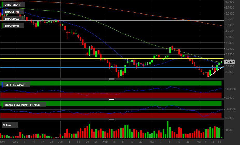 Le azioni Unicredit continuano a scambiare in rialzo in questi giorni, dopo un primo sell-off scaturito dalla confusione sui dettagli del fondo Atlante. Questa mattina le azioni della banca milanese continuano a viaggiare in territorio positivo, segnando al momento un allungo del +0,82% a quota €3,3434.
