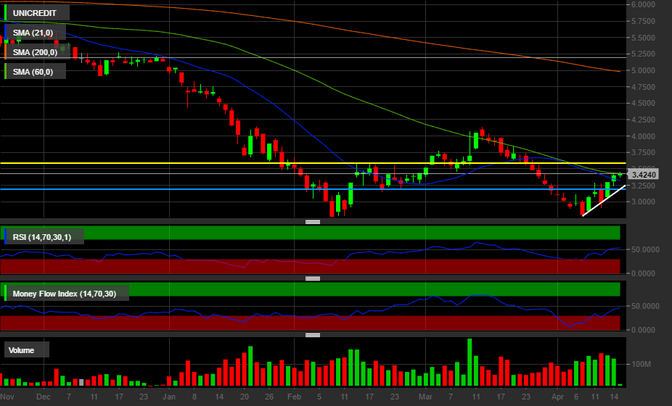 Le azioni di Unicredit si trovano in una importante zona di resistenza delimitata dalla media mobile a 60 periodi a quota €3,4315. Nella seduta di ieri il titolo della banca milanese ha rotto la prima resistenza psicologica posta dalla media di breve periodo a quota €3,3471 con buoni volumi, il che conferma la bontà della rottura del livello. Adesso saranno necessari ulteriori volumi per oltrepassare l’attuale resistenza che, se superata, proietta il titolo verso quota €3,6.