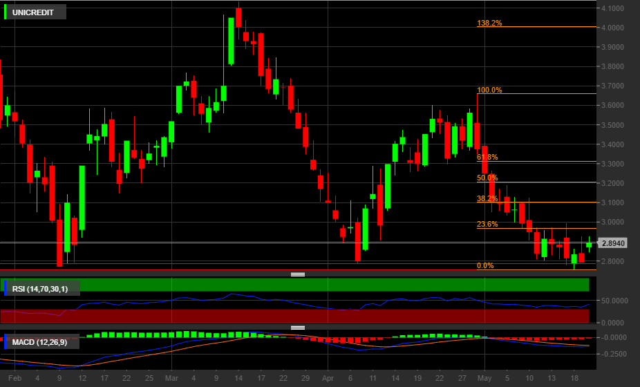 Le azioni Unicredit aprono l’ultima giornata della settimana con un deciso rialzo (+4,00%), risalendo sopra quota €2,9 dopo il minimo a €2,76 toccato due giorni fa.
