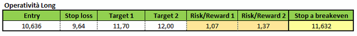Il primo entry level potrebbe essere individuato alla rottura dei top di oggi, a 10,442 euro, mentre il secondo a 10,83 euro, area che comporterebbe la violazione della resistenza menzionata prima. Il prezzo medio di carico è pari a 10,636 euro.
