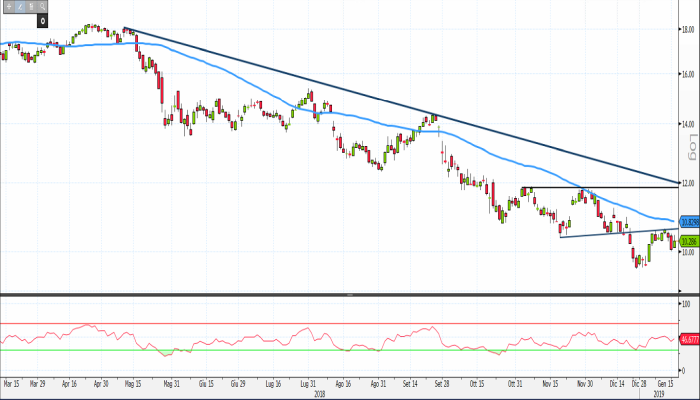 La risposta dei compratori a ridosso della soglia psicologica dei 10 euro spinge a pensare che un buon punto di minimo sia stato raggiunto. Si potrebbero quindi valutare strategie di stampo long sulle rotture delle prossime resistenze