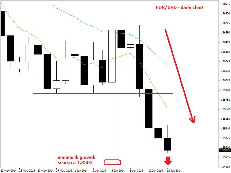 Draghi ha poi dichiarato che ci sono segnali di ripresa nel mercato del lavoro, anche se la disoccupazione resta ancora a livelli record. Sul mercato dei cambi l’euro continua a subire la forte pressione dei venditori, in particolare contro quelle valute maggiormente adottate nei carry trade (AUD e NZD). Anche oggi la moneta unica perde colpi: il tasso di cambio euro/dollaro è molto vicino ai minimi di 1,35, toccati una settimana fa nel corso del meeting della BCE. L’eventuale breakout esplosivo di questo supporto potrebbe far scendere subito le quotazioni a 1,3480 – 1,3470, ma soprattutto dare il via a una nuova gamba ribassista fino a 1,34 prima e 1,33 poi.