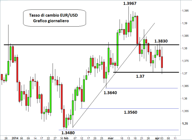 Sul forex il tasso di cambio euro/dollaro è stato respinto con decisione da area 1,38 e si è diretto velocemente verso l’area di supporto di 1,37. I prezzi hanno violato temporaneamente questa area chiave, scendendo sui minimi a un mese a 1,3698. Tuttavia il breakout di 1,37 non è stato esplosivo e i prezzi hanno messo a punto una fase di consolidamento intraday tra 1,3725 e 1,37. Il cambio potrebbe ancora accelerare al ribasso, in caso di breakout ribassista dei bottom di ieri. Molto dipenderà probabilmente dal dato dei non-farm payrolls americani attesi questo pomeriggio. Se il cambio Eur/Usd si confermerà sotto 1,37, i prezzi dovrebbero approfondire il ribasso con primo target a 1,3640 e secondo obiettivo tecnico posto a 1,3560. Al momento appare difficile la risalita, che si avrebbe solo con una chiusura superiore a 1,38.