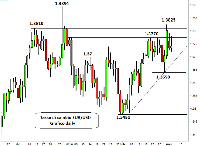 Il tasso di cambio euro/dollaro sta evidenziando una fase di congestione di brevissimo periodo, che fa seguito al peggioramento della crisi geopolitica in Ucraina. Dopo aver superato quota 1,38 venerdì scorso, il cambio euro/dollaro ha aperto in gap down domenica sera e ha iniziato a muoversi intorno a 1,3750. Il cambio sembra tenere bene l’area di supporto di 1,37, ma ora i riflettori sono pronti ad accendersi sul meeting della BCE che domani sarà chiamata a comunicare il nuovo livello dei tassi di interesse nell’eurozona. L’ultimo discorso di Mario Draghi, avvenuto lunedì con l’audizione al Parlamento europeo, ha posto l’accento sul problema della bassa inflazione nell’area euro.