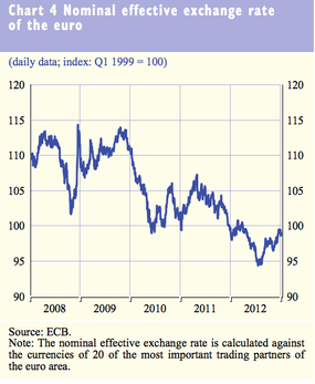 Il 9 gennaio 2013, il tasso di cambio nominale effettivo dell’Euro, misurato contro le valute dei 20 partner di trading più importanti dell’Eurozona, è stato rivelato allo 0.8% al di sopra del livello registrato il 1 dicembre 2012 e allo 0.3% al di sotto del livello dell’anno precedente (grafico 4 e tabella 3).