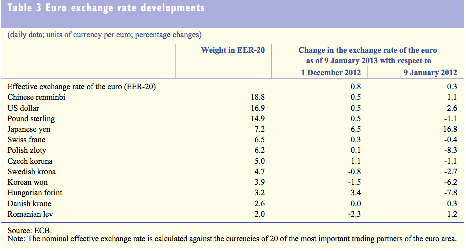 In termini bilaterali, nell’ultimo mese l’Euro è stato apprezzato contro tutte le major del mercato. Tra il primo dicembre 2012 e il 9 gennaio 2013, l’Euro ha guadagnato lo 0.5% contro il Dollaro USA e il 6.5% contro lo Yen Giapponese.