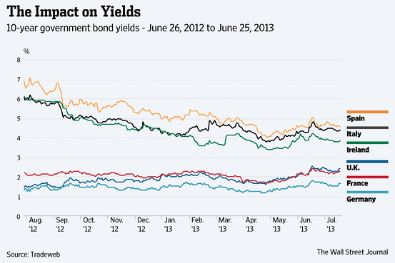 In due semplici parole: Spagna e Italia. Esattamente un anno fa, i rendimenti sui titoli di Spagna e Italia erano del 7.4% e del 6.5%. I mercati avevano iniziato a mettere in conto la seria possibilità del fallimento dell’Euro.