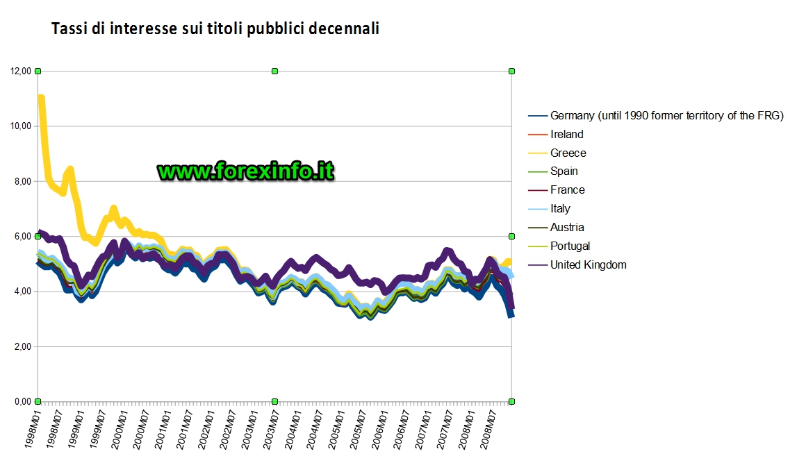 Ciò ha consentito quella convergenza dei tassi di interesse sui titoli di stato manifestatasi nel primo decennio dell’Euro come si può osservare nella figura qui sotto: