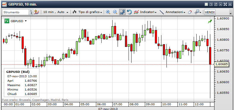 Il grafico a 10 minuti mostra come il cambio sterlina/dollaro sia pari a 1.60685