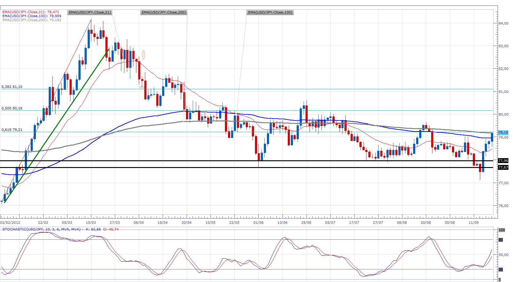 Il cambio UsdJpy si trova ad affrontare, proprio in questi minuti in cui scriviamo, la resistenza più interessante per il medio/lungo periodo. A 79.20 transita infatti la media mobile di lunghissimo periodo (200) su grafico giornaliero ed in grado di riportare ad una nuova salita del cambio. In teoria lo scoglio più forte da superare si trova a 80.50 circa (livello di riferimento sino da aprile scorso).