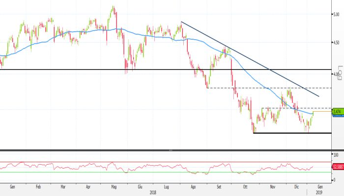La conferma di quanto detto arriverebbe con una chiusura odierna sopra i 3,45 euro, fermo restando che il primo vero ostacolo di questo impulso è situato a ridosso della soglia psicologica dei 3,50 euro. In questa fase dunque per strutturare strategie rialziste in linea con l’attuale quadro tecnico converrebbe attendere la conferma del breakout di 3,50 euro e lasciar correre la posizione sino al raggiungimento del target a 3,80 euro.