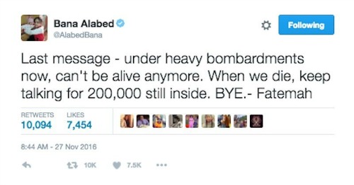 Bana aveva trovato un modo di sfuggire alla guerra grazie al profilo Twitter della madre, tramite il quale aggiornava i suoi followers su quello che accadeva ogni giorno ad Aleppo grazie a tweet con foto e video. Tra i suoi tweet più celebri uno dei primi pubblicati, in cui la bambina è ritratta in una foto mentre legge, tutto accompagnato dalla didascalia “leggo per sfuggire alla guerra”.