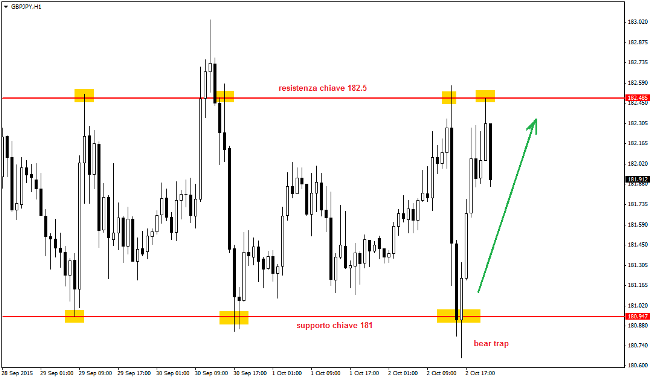 Il grafico in alto del cross summenzionato mostra un iniziale movimento ribassista deciso fino all’area di supporto chiave di 181. Avviene anche un breakout, ma in realtà i prezzi restano poco tempo sotto questa area chiave del mercato. E’ sicuramente una bear trap, ovvero una trappola per Orsi (cioiè i venditori). Si forma anche una candela di inversione rialzista con lunga lower shadow: il segnale long è netto e va provato con target sull’area di resistenza chiave di 182,5.