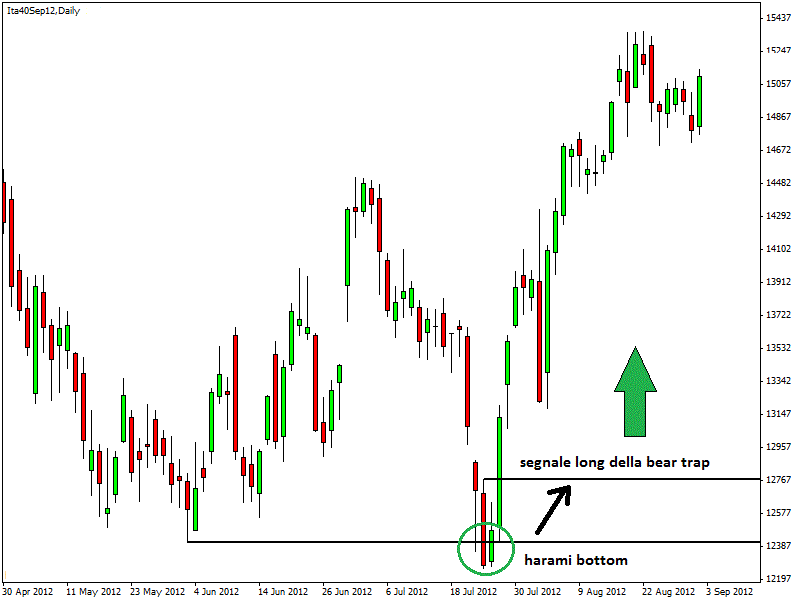 Tuttavia, grazie all’utilizzo dell’analisi tecnica, non solo è possibile evitare queste trappole ma anche sfruttarle per ottenere un consistente guadagno con transazioni di breve-medio periodo. Nell’esempio in alto sull’indice azionario italiano Ftse Mib, analizzato attraverso il CFD Ita40Sep12, è possibile notare la comparsa di un harami bottom sui minimi di periodo, ma soprattutto di un bear trap (trappola per orsi, cioè per venditori). Dal momento in cui scatta il segnale long, l’indice mette a segno un robusto rally nelle sedute successive.