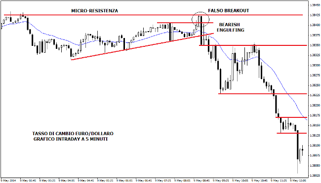 Si può notare che i prezzi effettuano il breakout di una micro-resistenza, ma improvvisamente avviene un’inversione molto robusta delle quotazioni proprio sui top intraday. Si forma un pattern ribassista noto come bearish engulfing, caratterizzato dalla presenza di due candele dove la seconda una un corpo nero che comprende interamente il corpo della prima candela. Il segnale short intraday è servito e a questo punto lo scalper, o il day-trader, può mettere a punto la sua strategia ribassista per cavalcare il trend discendente nel corso delle ore successive.