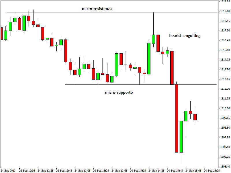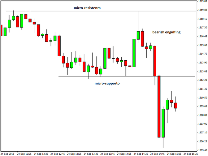 Il pattern "engulfing" è tra i più affidabili in assoluto e consente di beneficiare di un rapporto rischio/rendimento spesso molto soddisfacente. Il case study presentato oggi ci porta al mercato dell’oro spot (gold), time frame a 5 minuti, che evidenzia la formazione di un bearish engulfing che fa seguito alla comparsa di una pin candle su una zona di micro-resistenza: una buona occasione da short da sfruttare nei minuti successivi.