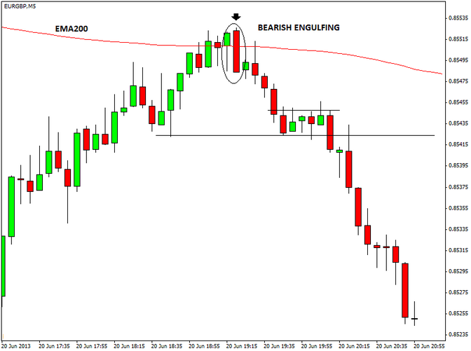 Andiamo a vedere un esempio pratico. Se si osserva il grafico a 5 minuti del tasso di cambio euro-sterlina, si può notare la formazione di un bearish engulfing in zona di resistenza. Il segnale di inversione del trend della candlestick analysis è di per sè molto affidabile, ma le probabilità di successo aumentano ancora grazie alla presenza della EMA200. Da questi livelli inizierà una robusta discesa dei prezzi.