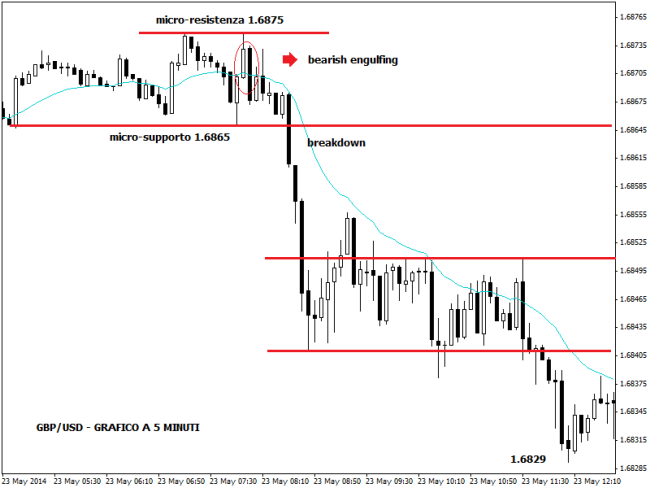 Il grafico in alto si riferisce al tasso di cambio sterlina/dollaro, time frame a 5 minuti, che mette in mostra un bearish engulfing su una zona di micro-resistenza. Il pattern ha implicazioni ribassiste e offre al day trader e allo scalper la possibilità di andare short sul Cable rischiando appena una manciata di pip. Quando poi avviene il breakout decisivo dell’area di micro-supporto, i prezzi danno il via a un trend ribassista notevole passando da area 1,6875 a 1,6829. Per il trader si è configurata davvero una ghiotta occasione di guadagno.