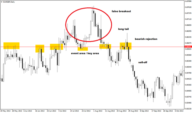 Per comprendere meglio come questi setup candlestick possano essere utili ai fini operativi, andiamo a vedere un esempio grafico. In basso viene mostrato il chart giornaliero del tasso di cambio tra l’euro e la sterlina britannica: un cross valutario molto liquido e mediamente non molto volatile. Dopo una serie di tentativi falliti da parte dei compratori di consolidare il trend rialzista, il cross EUR/GBP viene interessato dalla comparsa di una minacciosa bearish rejection su una event area, ossia una regione del prezzo dove il mercato ha mostrato spesso una forte attività e specifici segnali operativi di price action.