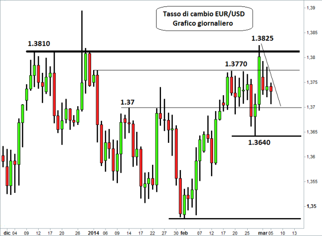 La prossima riunione della Federal Reserve è prevista per il 18 e 19 marzo, ma domani i riflettori saranno puntati sul dato dell’occupazione a febbraio che quindi potrebbe risentire delle pessime ed estreme condizioni meteo di questo rigidissimo inverno americano. Sul forex il dollaro americano appare in lieve ripresa contro euro, franco svizzero e yen. Il cambio euro/dollaro, in attesa del meeting odierno della BCE, è tornato a testare l’area di supporto posta poco prima di 1,37.