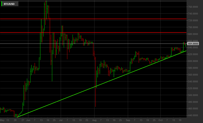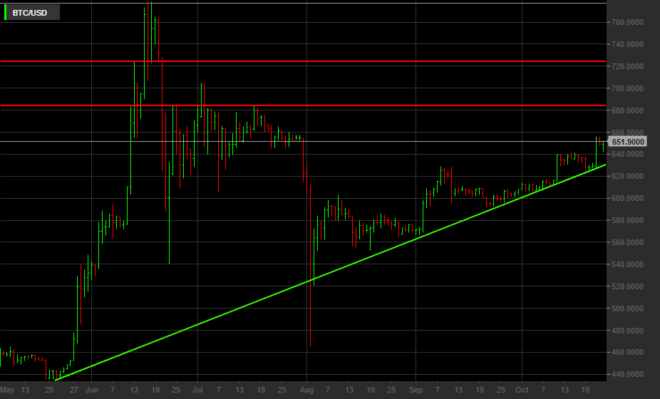 La quotazione dei bitcoin ha tagliato durante il weekend quota $650, così come non accadeva dal mese di luglio.