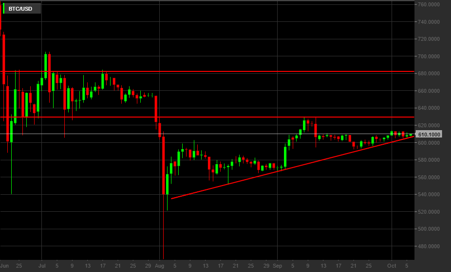 La quotazione dei bitcoin si muove in equilibrio sopra la soglia psicologica dei $600 da diversi giorni, mantenendo valida la trendline segnata in rosso nel seguente grafico: