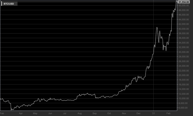 La quotazione BTC/USD dal 18/02/2020 al 18/02/2021