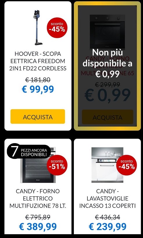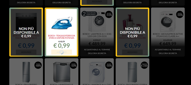 Ma una volta che la Black Hour ha preso il via (mentre scriviamo l’articolo è in corso l’ora segreta di oggi, in partnership con Candy), non si riesce a vedere quali articoli sono disponibili sul sito a 0.99€. Anche se si legge “Black Hour in corso” e ci sono ancora tot prodotti scontati, nei fatti sono invisibili, risultano non disponibili o riuscire a trovarli e metterli nel carrello si rivela un’impresa ardua.